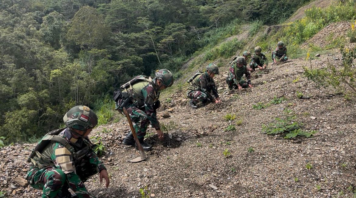Tentara Nasional Indonesia (TNI) Personel Satgas Yonif 521/DY Pos Kelila dalam program pembinaan teritorial terpadu melaksanakan penghijauan dengan menanam pohon di Kampung Kelila kab. Mamberamo Tengah.