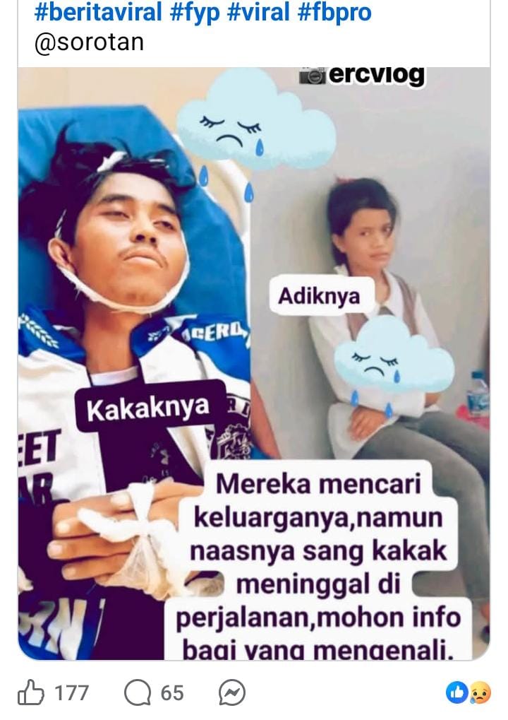 “Semoga keluarganya bisa melihat postingan ini, dan bisa menemukan anak dan kelaurga bisa ketemu jasadnya”, ujarnya bpro@sorot akun di facebook.