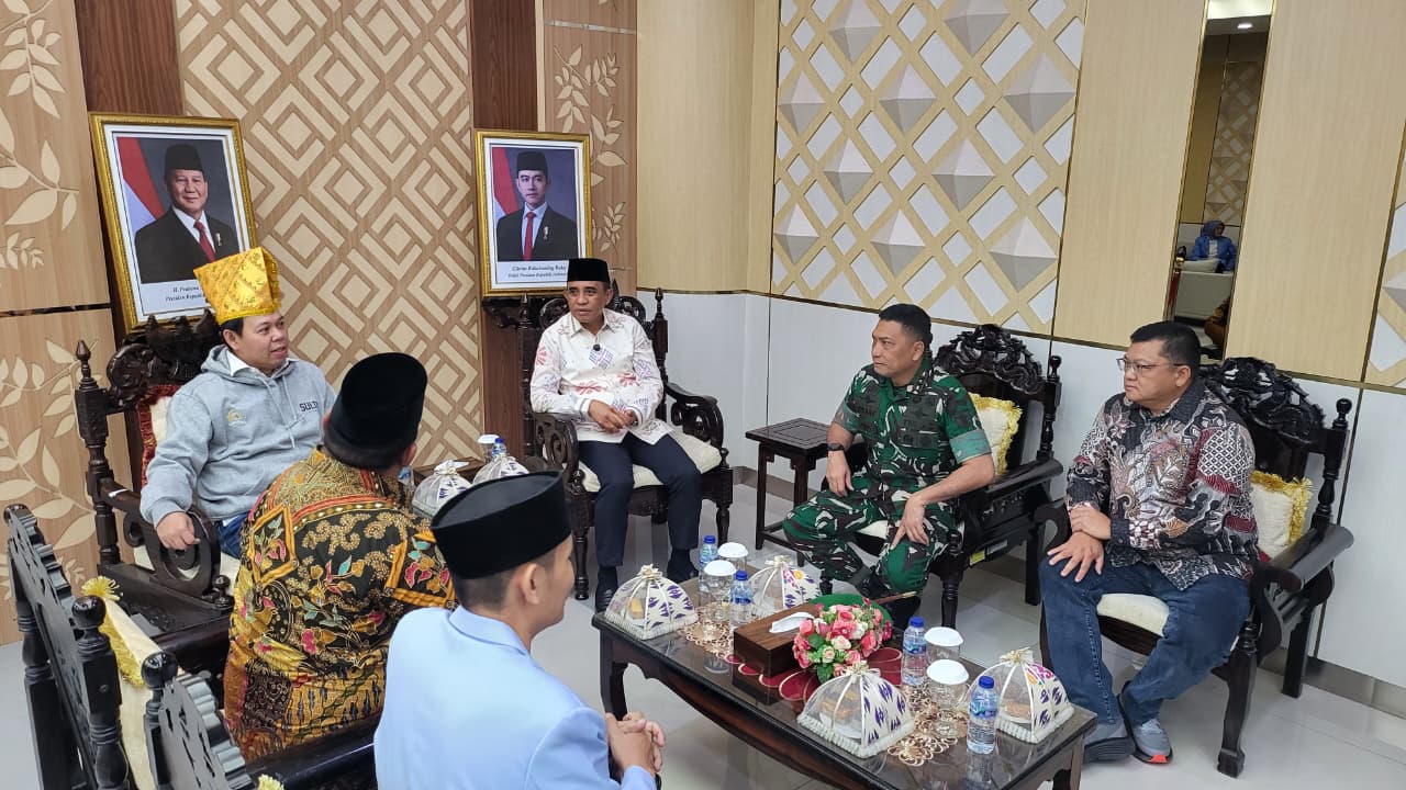 Panglima Komando Daerah Militer XXIII/Palaka Wira, Mayjen TNI Jonathan Binsar Perluhutan Sianipar, bersama Gubernur Sulawesi Tengah, Dr. H. Anwar Hafid, M.Si., menyambut kedatangan Ketua Dewan Perwakilan Daerah Republik Indonesia (DPD RI), Sultan Baktiar Najamudin, dalam kunjungan kerja di Kota Palu, Minggu (14/9/2025).